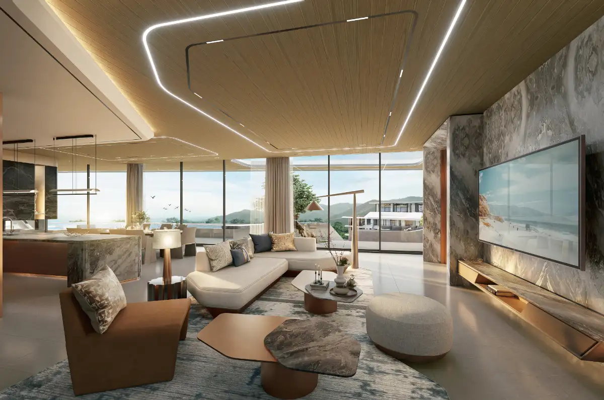 Hythe by Botanica is celebrated for its organic, free-flowing design, where buildings mimic natural curves, and materials like wood and stone create a soothing environment. The penthouse integrates this philosophy on a grander scale. From every corner, you’ll enjoy unobstructed views of Phuket’s lush greenery, distant sea horizons, or serene sunsets.