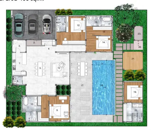 The 4-bedroom pool villa at Janya Villas spans a total area of 406 square meters, offering expansive living areas for families who value both privacy and shared experiences. The villa is built with high-quality, durable, and sustainable materials that ensure lasting strength and beauty. Every aspect of the villa reflects careful planning, from the spacious bedrooms to the luxurious pool deck and outdoor sala.
