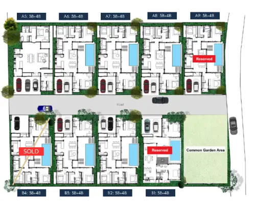 Private Luxury Living – Each villa comes with its own swimming pool, deck, and modern amenities for a resort-style lifestyle.