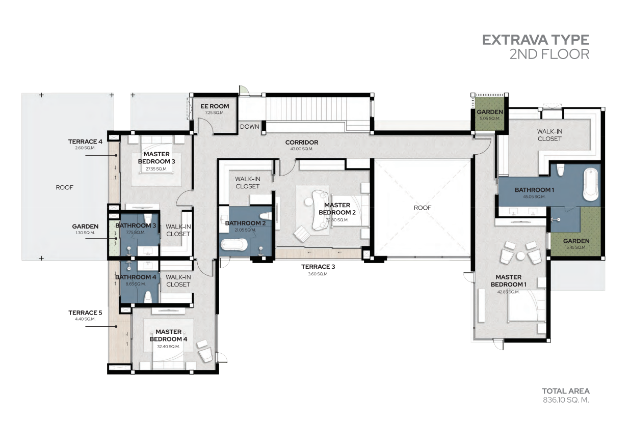 These magnificent pool villas come in two expansive types—Extrava (836.10 sq.m.) and Tranquil (727.45 sq.m.)—with layouts offering 4 to 5 bedrooms across two floors. Land plots range from 590.98 to 914.02 sq.m., providing ample space for luxurious indoor-outdoor living.