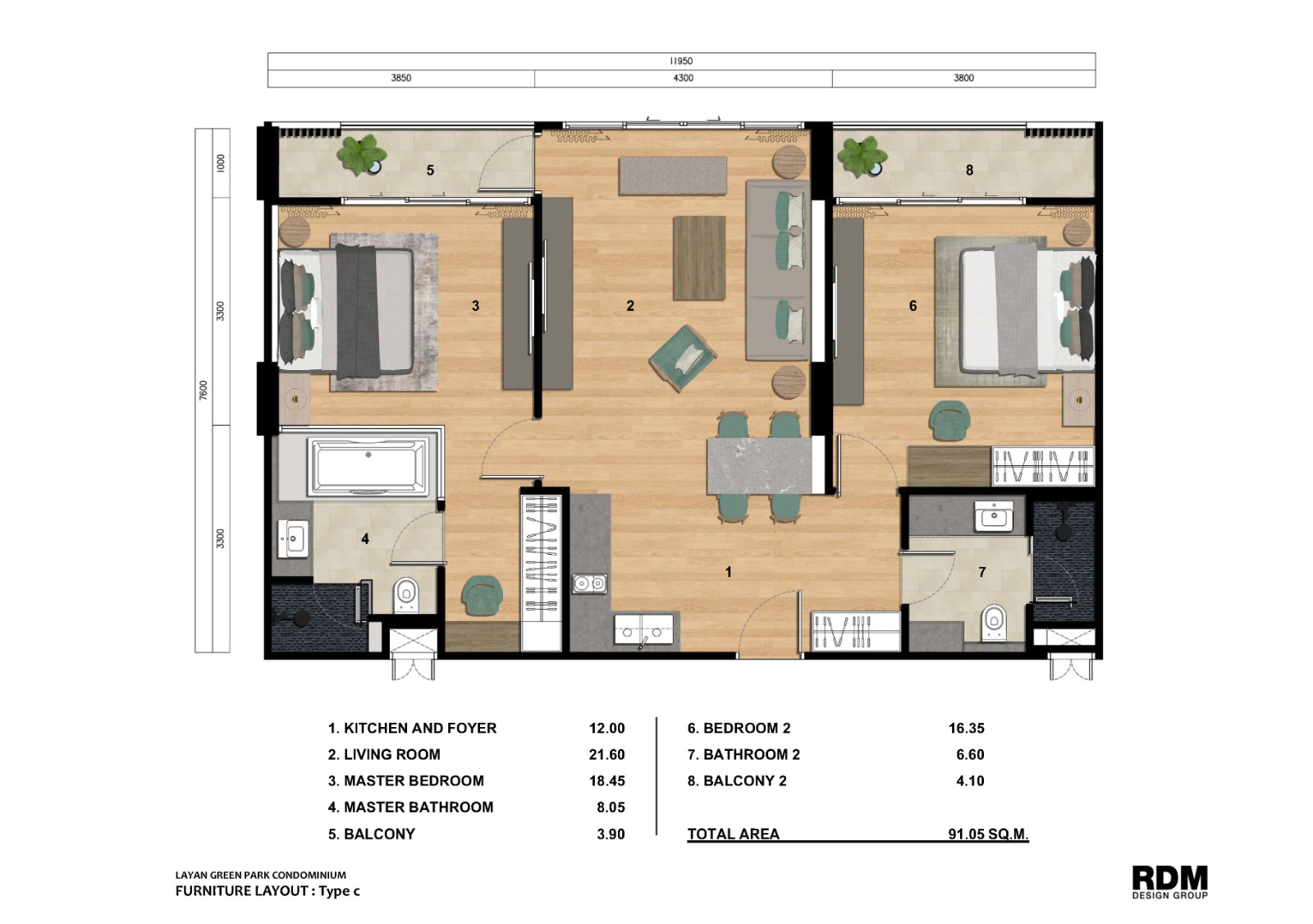With a total area of 90 sqm, the Layan Green Park 2BR Unit is thoughtfully designed for both functionality and style. This unit includes: