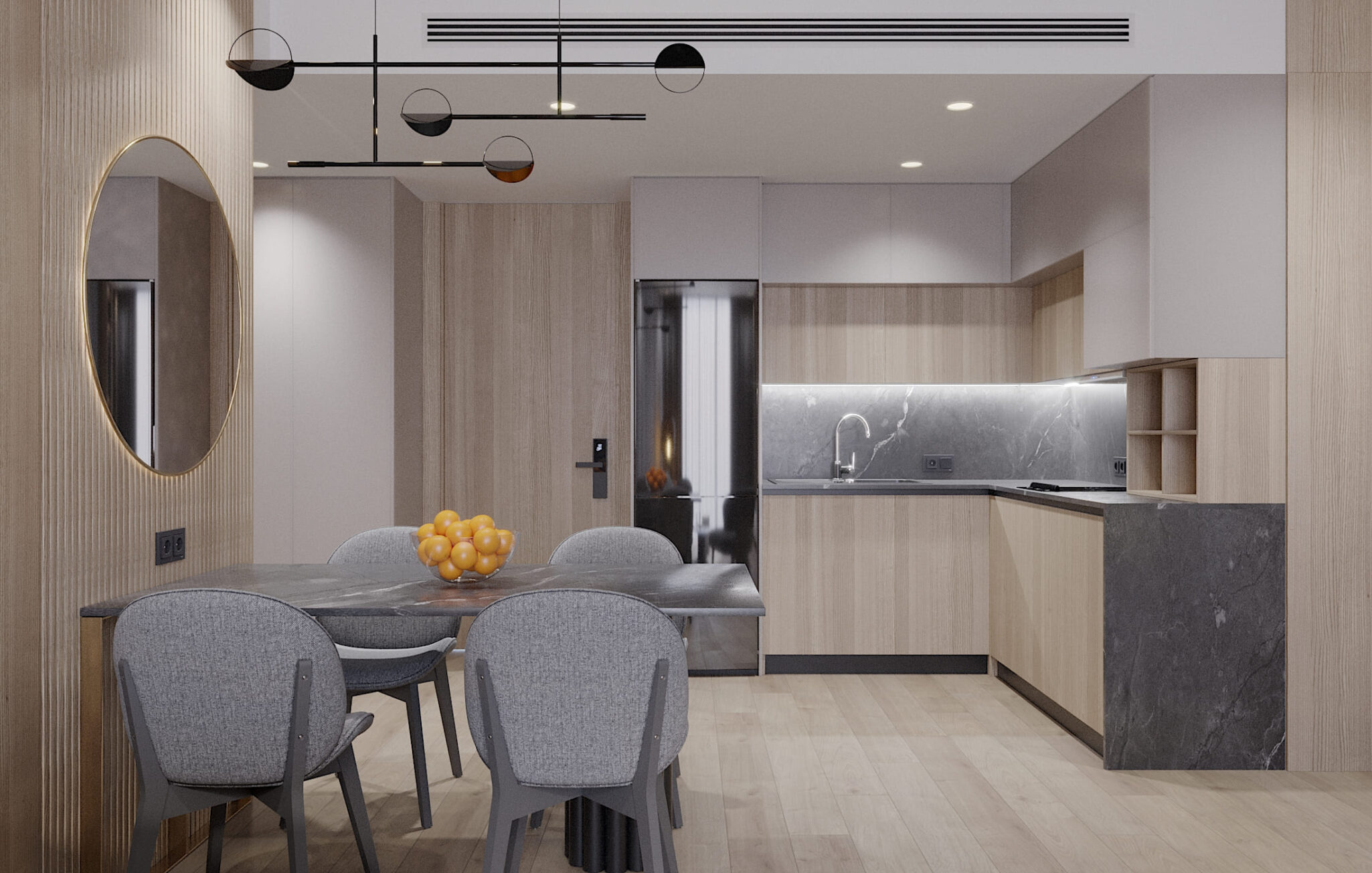 Fully equipped kitchen featuring moisture-resistant cabinets, artificial stone countertops, built-in fridge, induction cooktop, and high-efficiency extractor