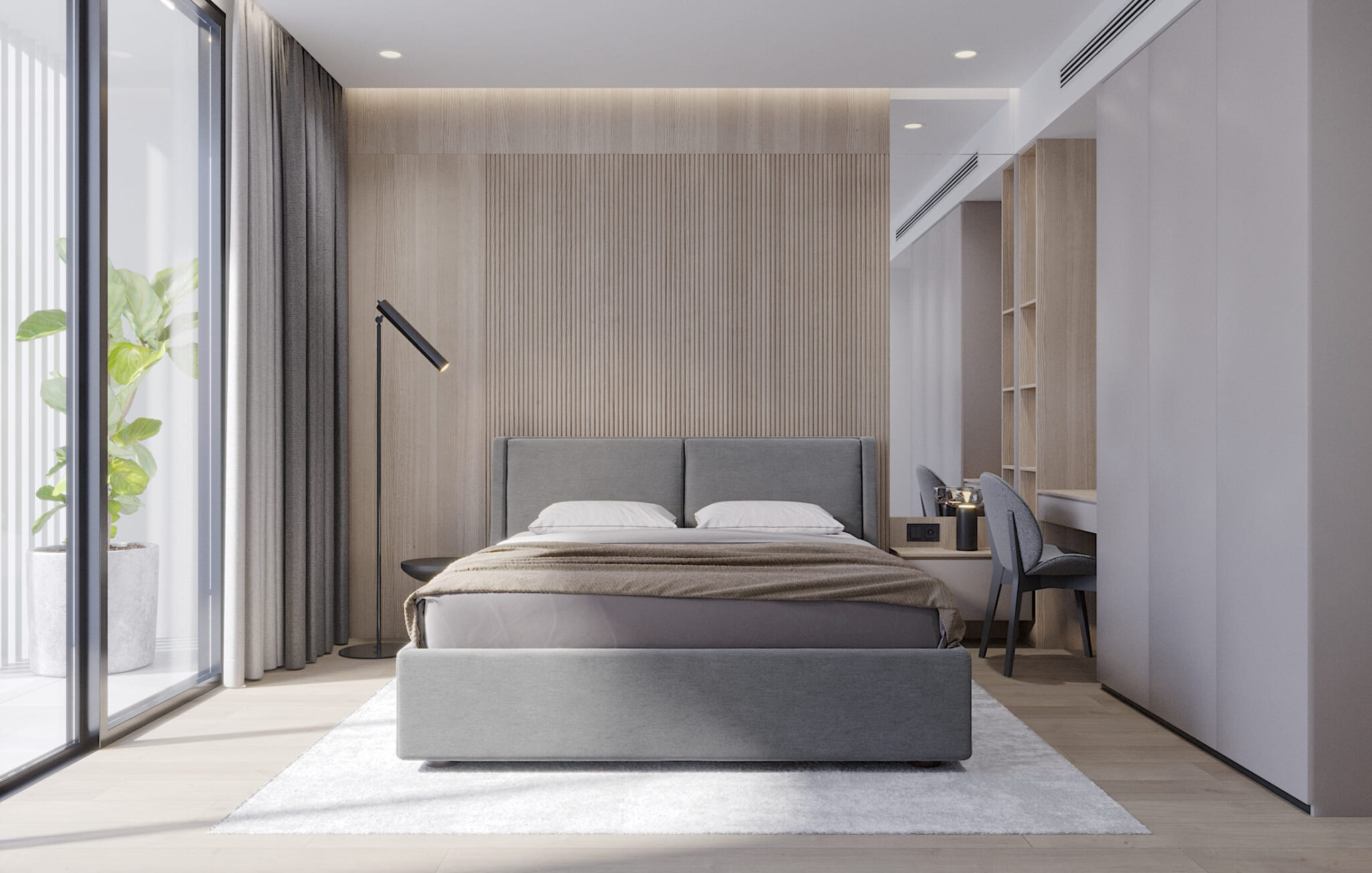 Two spacious bedrooms, each with large built-in wardrobes and soft ambient lighting