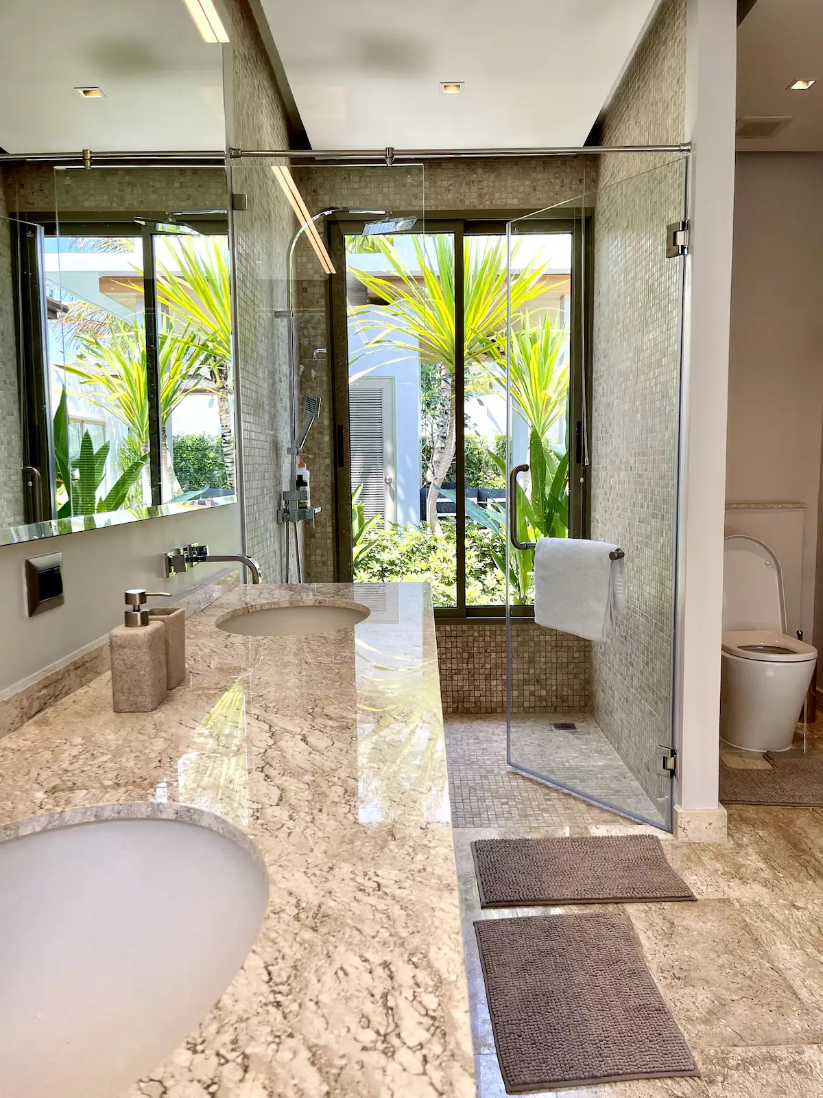 Master bedroom: Includes four wardrobes, a sitting area, dressing table, and king-size bed. The ensuite bathroom features dual sinks, bathtub, and both indoor and outdoor rain showers. The master suite opens directly to the pool deck.