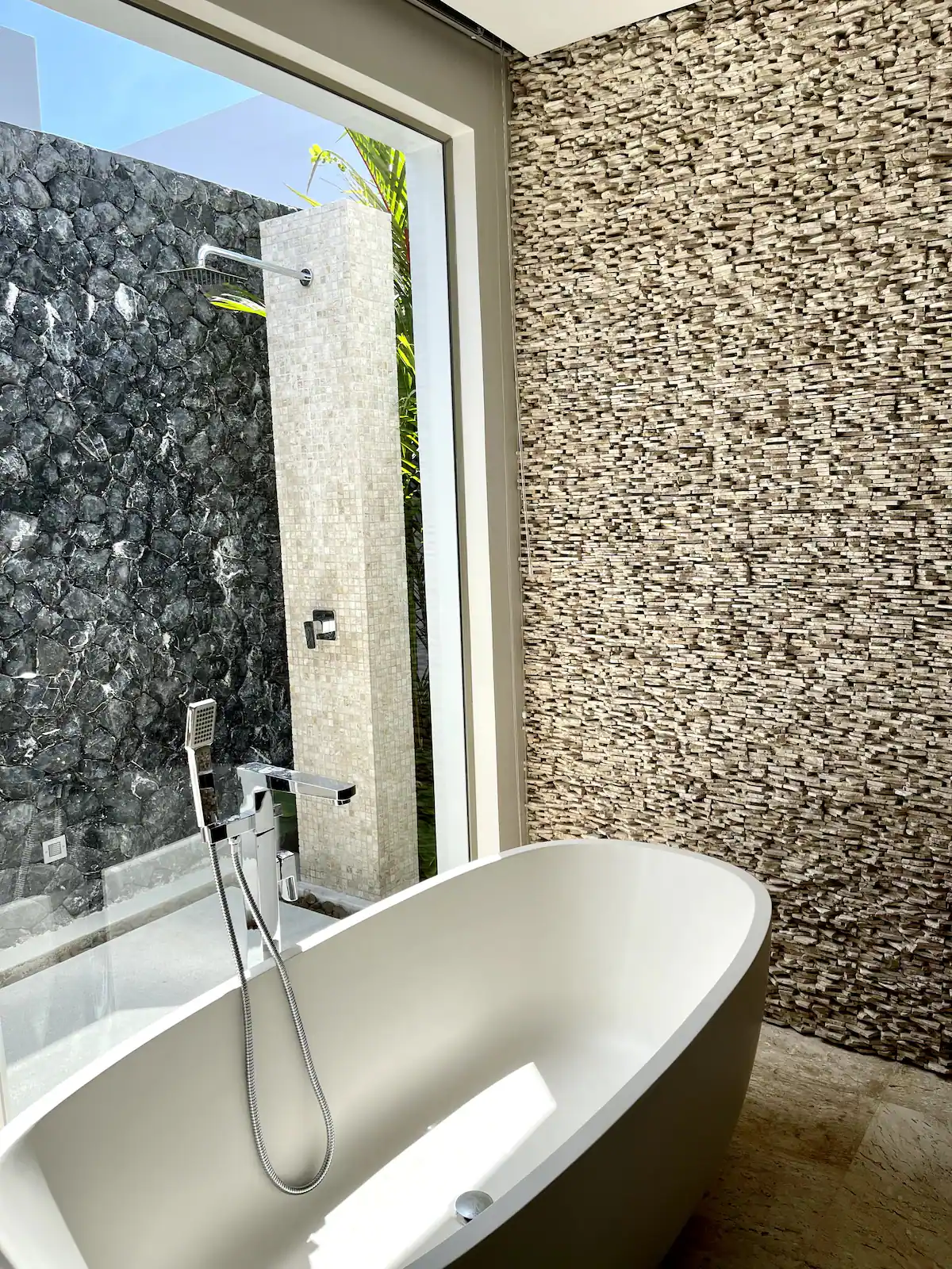 Sunbeds, outdoor sofas, and an outdoor powder room