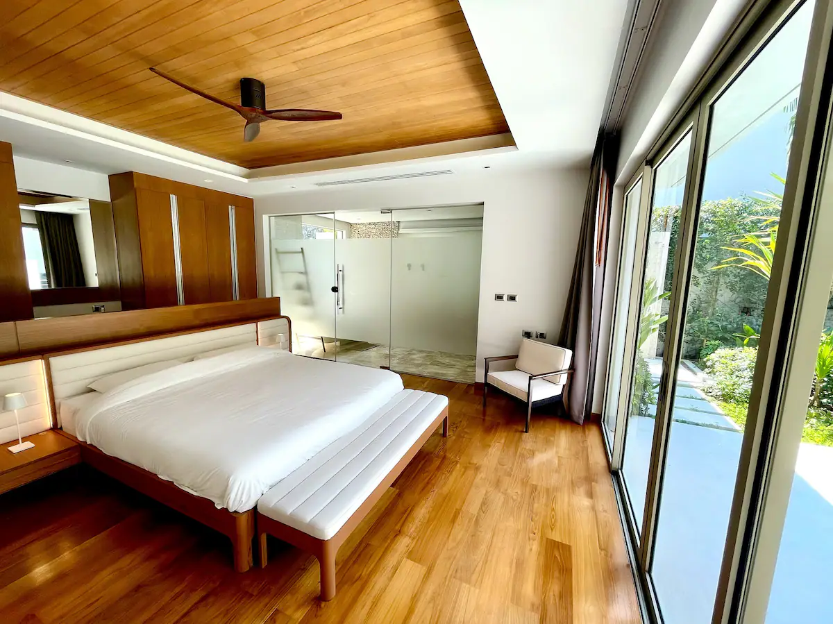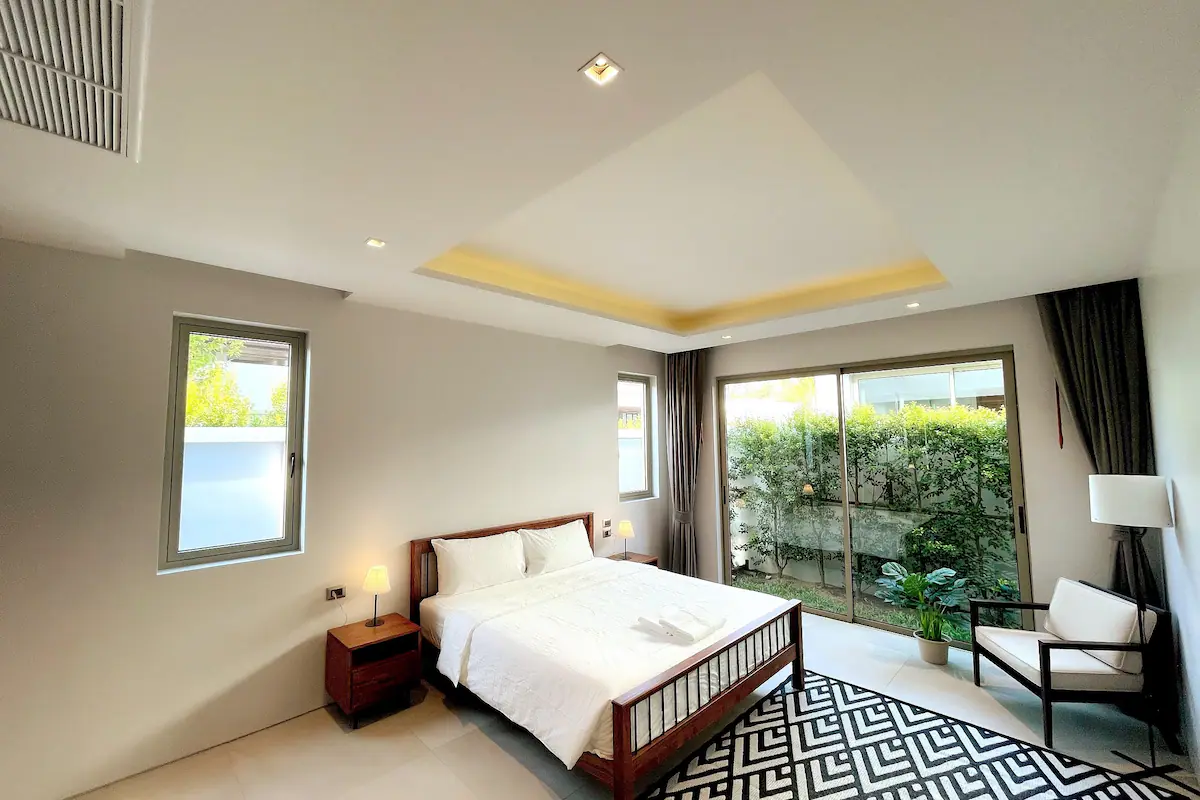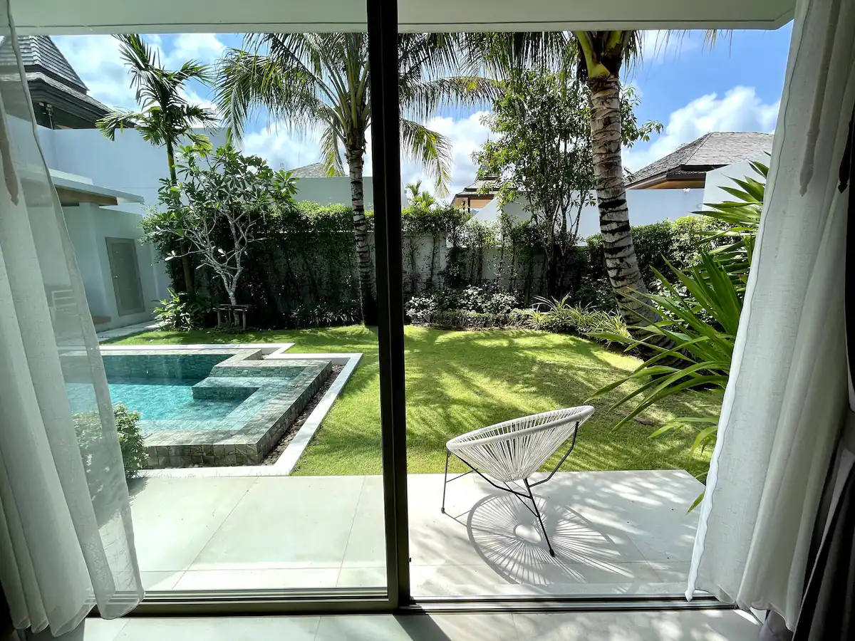 Third bedroom: Offers a separate entrance from the main villa, private sitting area facing the garden, and direct access to the pool and jacuzzi — perfect for guests or private rentals.