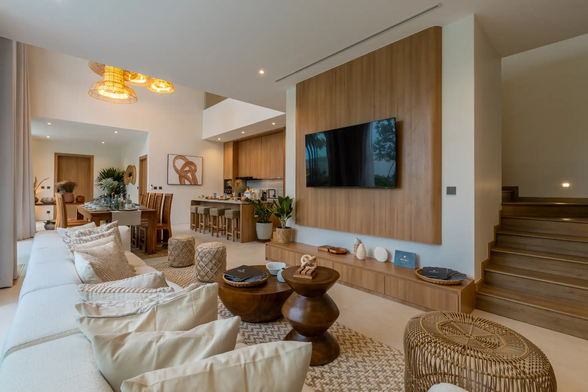 Step through the grand entrance of Mouana Grande Type B into a welcoming open-plan layout that reflects modern minimalism with tropical flair. The spacious living area connects naturally with the elegant dining room and a sleek Western kitchen, perfect for hosting dinner parties or relaxing with family.