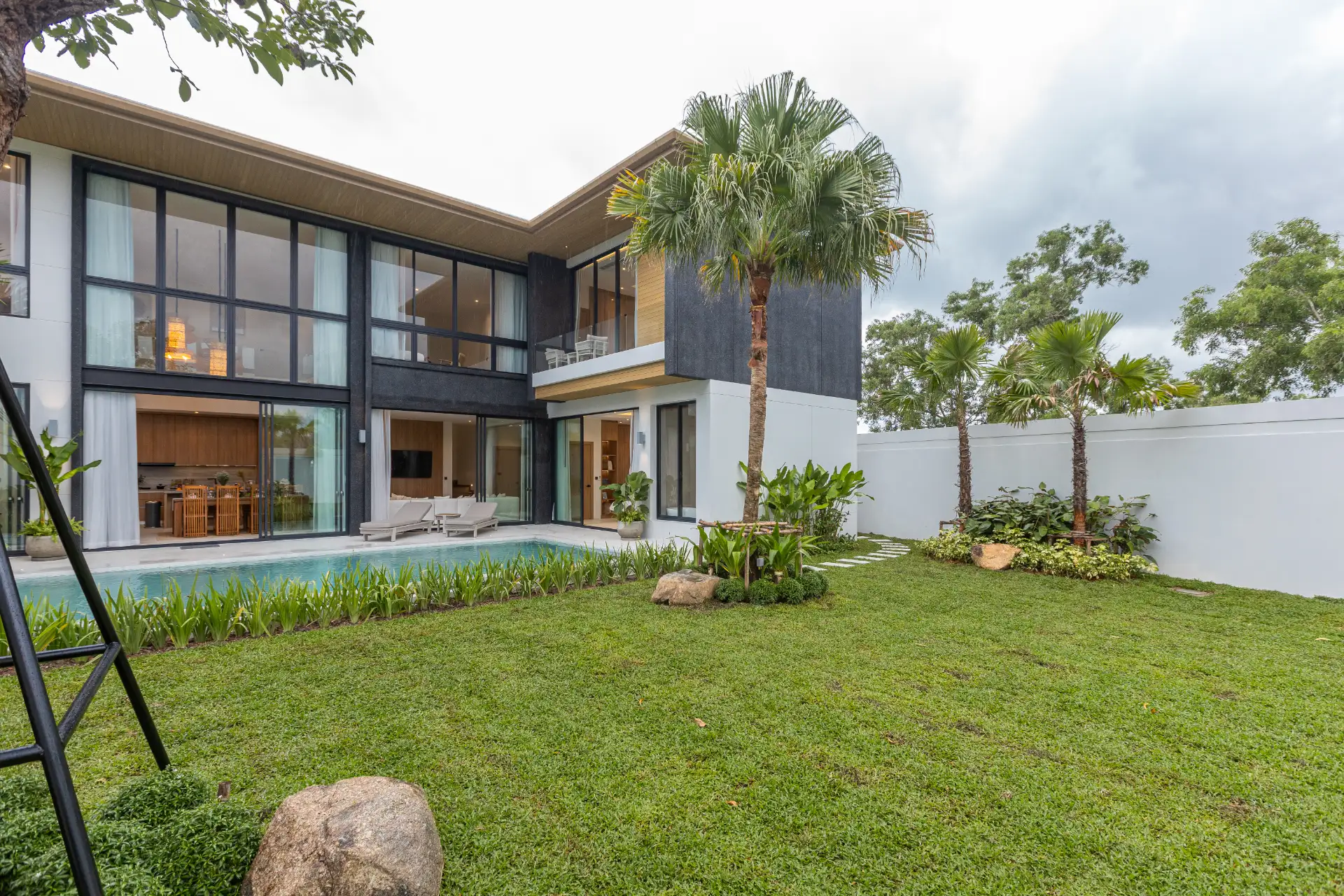 The villa also includes a Thai kitchen, providing a designated space for authentic cooking, and a guest toilet for added convenience. Storage is well thought out, with a dedicated laundry area, washing zone, and garage, ensuring functionality never compromises style.