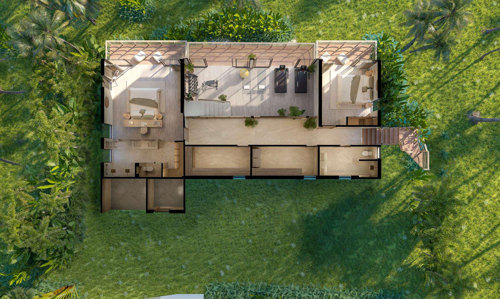 Set on an elevated hillside within an 8,000 sqm lush tropical estate, Pacific Sunset is developed by the renowned Pacific Palisade team, known for their meticulous craftsmanship, contemporary tropical design, and attention to detail. The project blends timeless elegance with modern comfort, using natural materials, earthy tones and traditional thatched roofs to create an authentic island atmosphere.