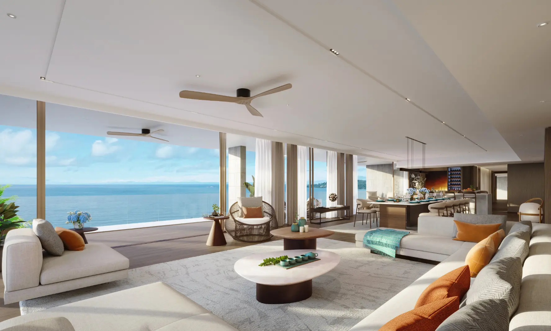 Inside, the open-plan living and dining areas are positioned to maximize ocean views, with expansive glazing that frames the coastline like a living artwork. The design emphasizes space, light, and fluidity, ensuring every moment in the penthouse feels connected to the sea.