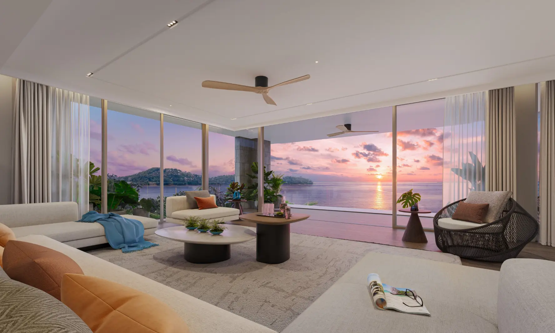 Large sliding doors connect interior living spaces to terraces, allowing natural light and sea breezes to flow throughout the home. From sunrise over the mountains to sunset over the Andaman Sea, every moment is framed by extraordinary views.