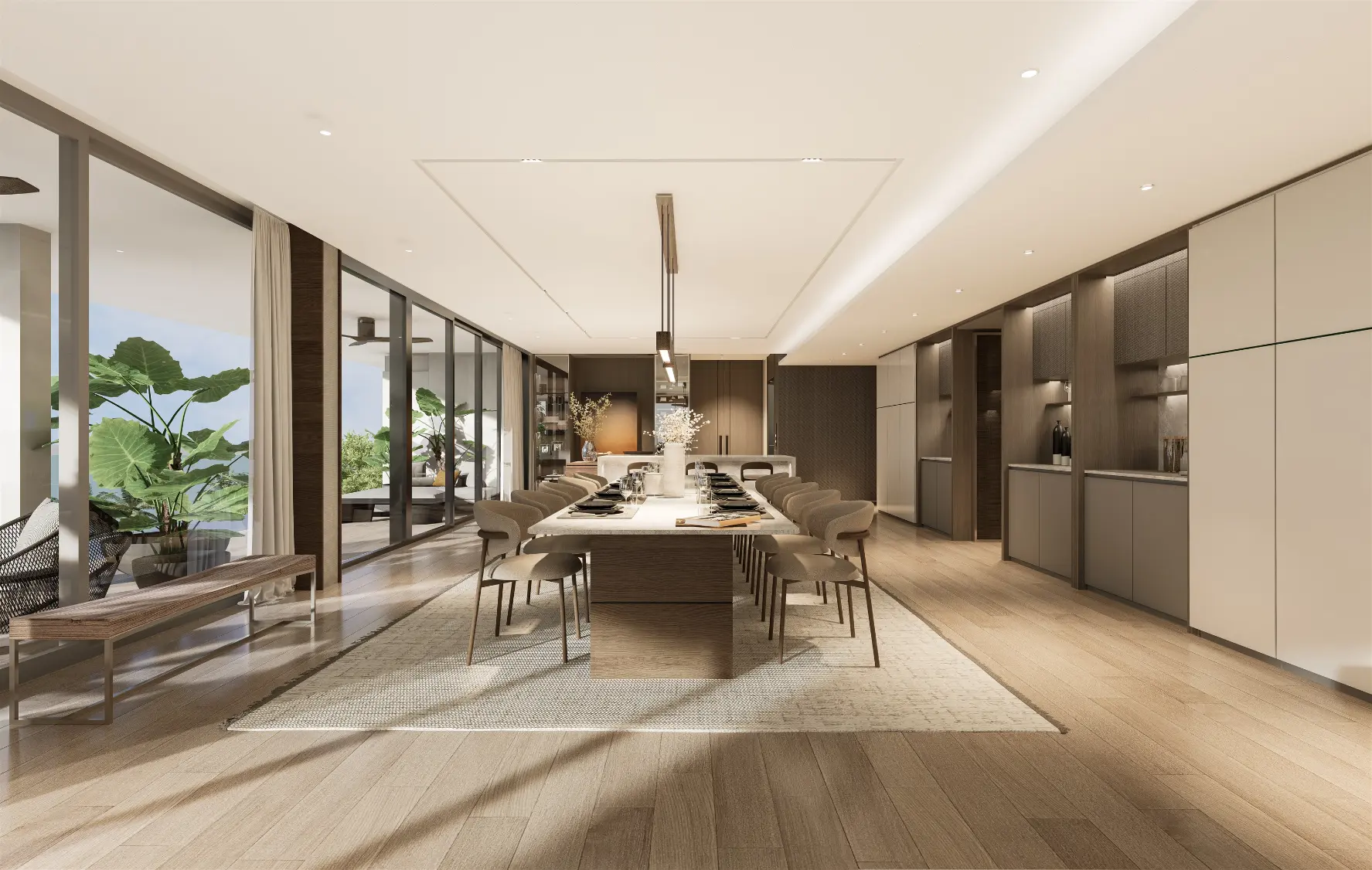 Every detail within the Penthouse at Banyan Tree Beach Residences Varuna reflects refined craftsmanship and premium materials. Flooring throughout the main areas combines elegant porcelain tiles and engineered wood, offering both beauty and durability. Internal ceilings are finished in gypsum with paint, complemented by special feature ceilings in synthetic wood that add warmth and architectural character.