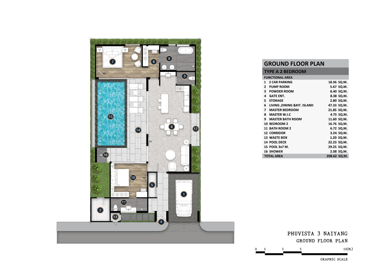 The Sonya villa type at Phu Vista 3 offers a sophisticated and serene lifestyle tailored to couples, small families, or investors seeking a luxurious yet practical property in Phuket. Designed with an emphasis on comfort and elegance, the Sonya villas encapsulate the essence of tropical living with their modern single-storey layout, private pools, and a prime location near Naiyang Beach and Phuket International Airport.