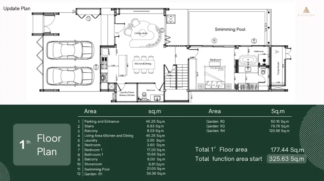 True to its name, Rachada—meaning “Leading to Joy”—these villas are built with the philosophy that everything begins at home. This 3-bedroom unit features 4 bathrooms, a total function area of approximately 325.63 sqm, and expertly designed living spaces across two floors. Every square meter is a celebration of clean lines, open flow, and luxurious touches.