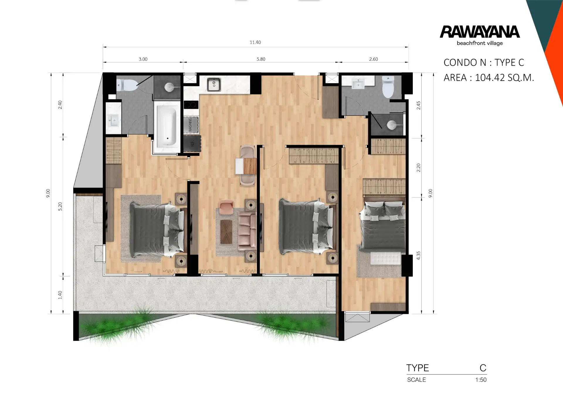 The Rawayana North Condo – 3BR units are designed to provide maximum comfort and space for residents who want a larger condominium in Phuket. With a total living area of approximately 104.3 square meters, these apartments offer an ideal layout for families, groups, or property owners who prefer extra living space.