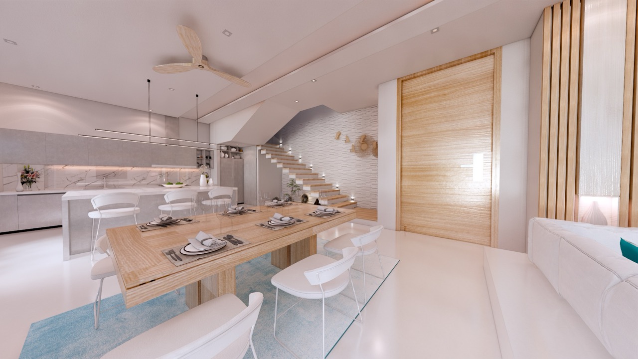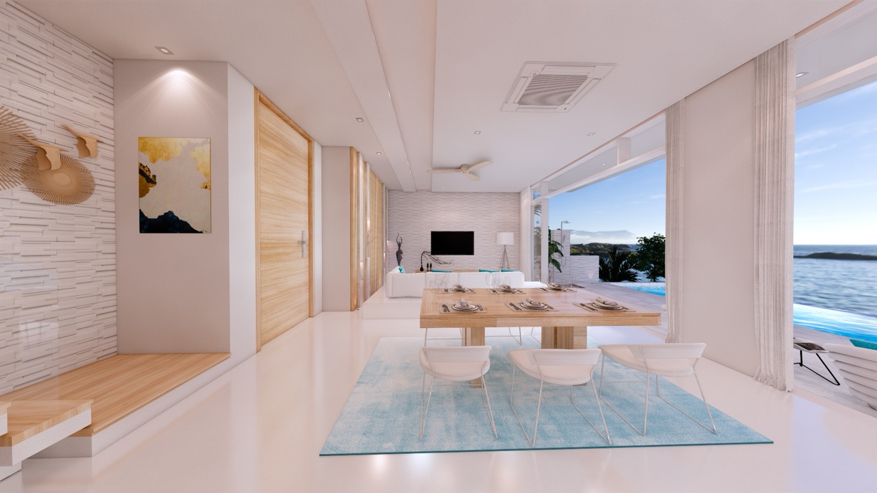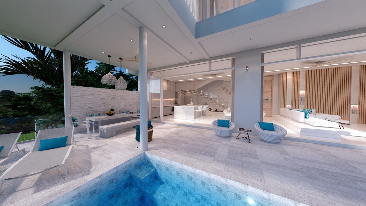 The open-plan living area is an architectural masterpiece, blending indoor and outdoor spaces effortlessly. Sliding glass doors open onto a private infinity pool and deck, allowing residents to fully enjoy the tropical ambiance. The adjoining dining area and contemporary kitchen are perfect for casual meals or entertaining, equipped with premium appliances and modern finishes.