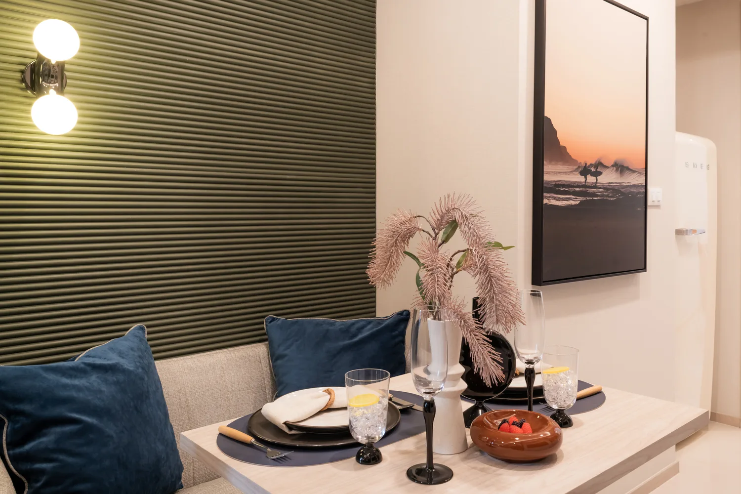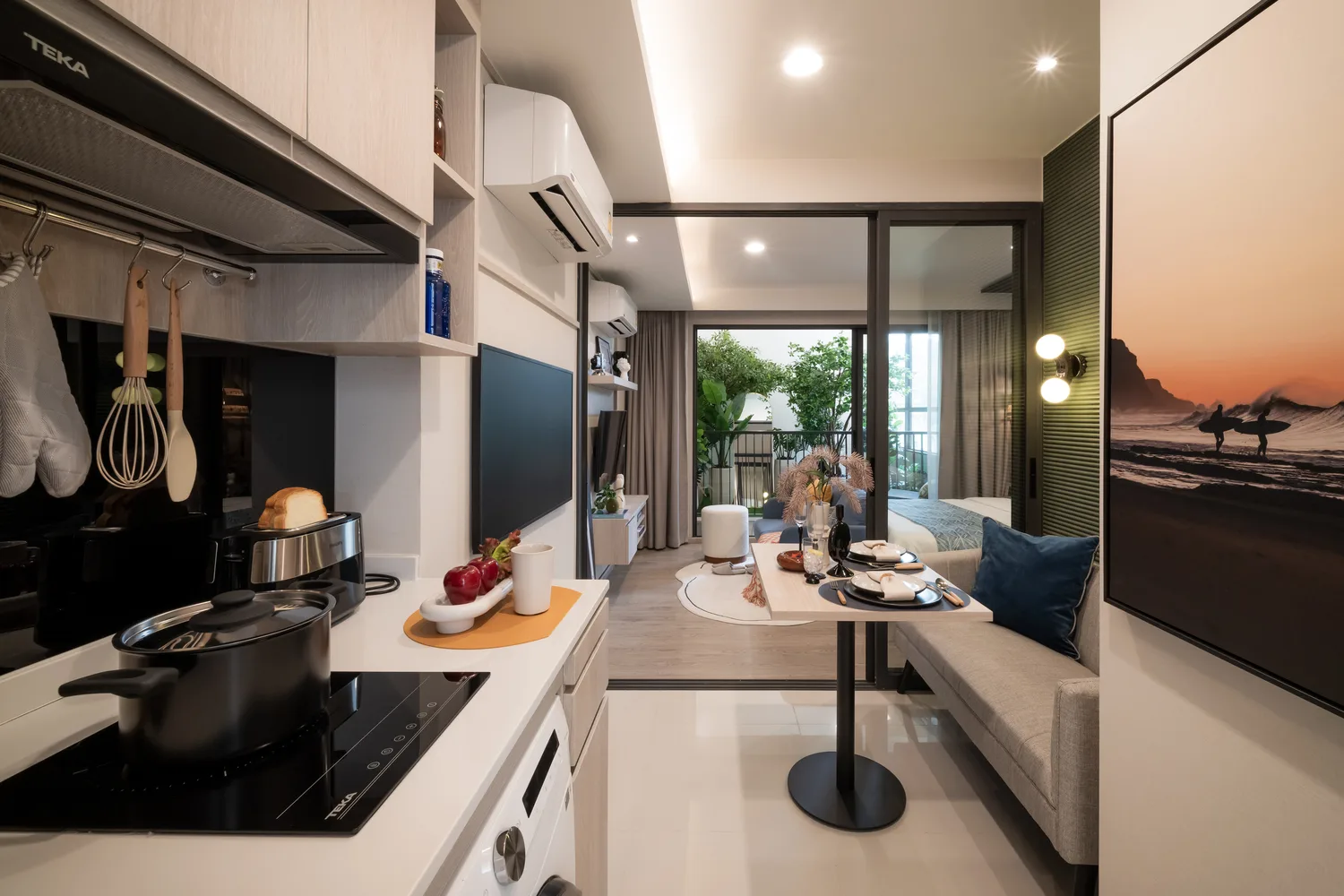 The living room, featuring a comfortable lounge area, is perfect for relaxing after a day at the beach or exploring Phuket. The layout flows seamlessly into the dining and kitchen area, which is fully equipped with high-quality appliances, including a refrigerator, stovetop, microwave, and ample storage. Whether you’re preparing a quick meal or entertaining guests, this space is designed to cater to your needs with ease.