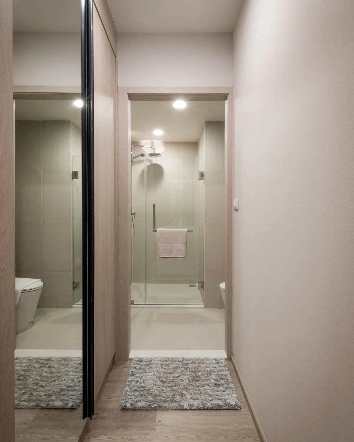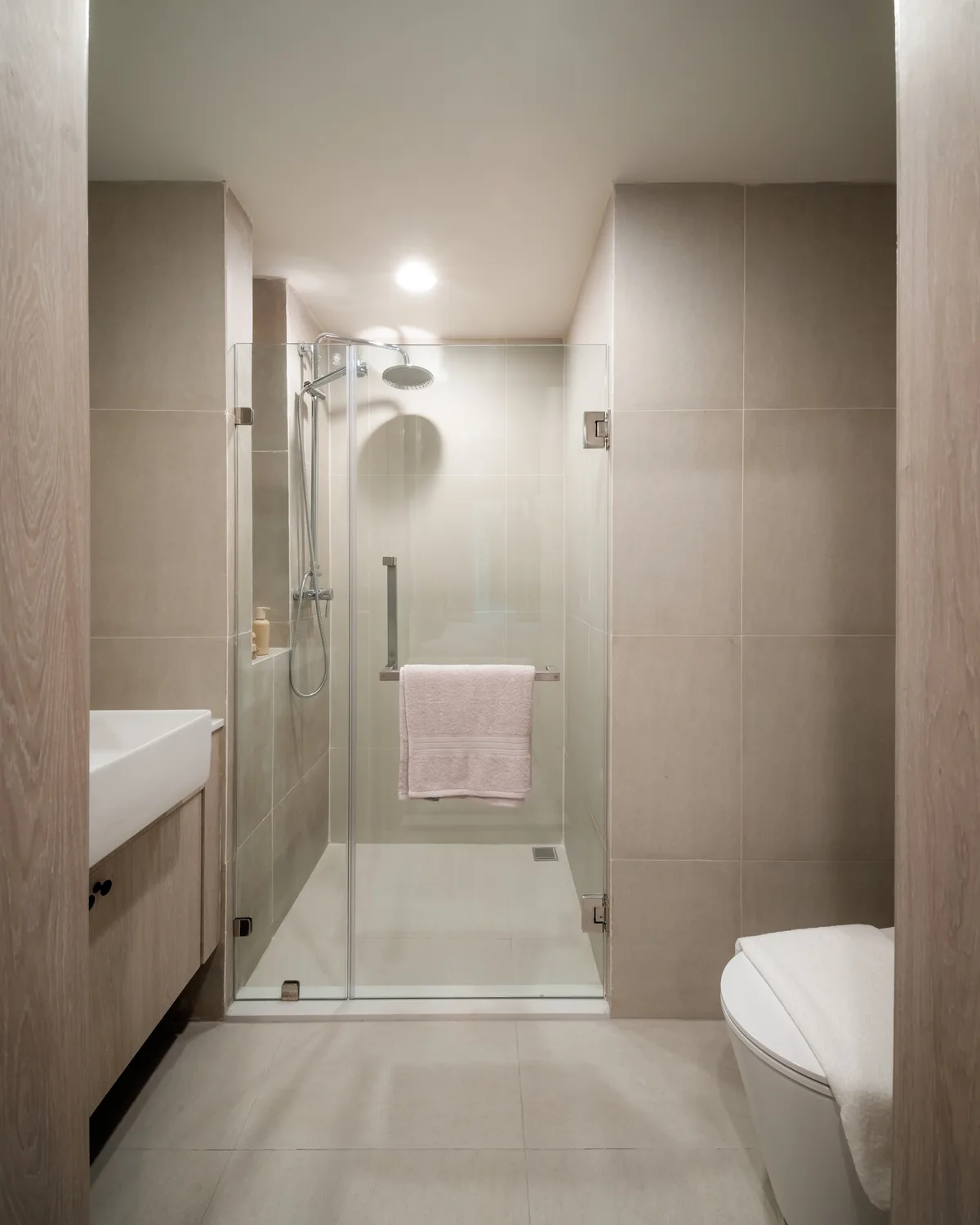 The bedroom is a peaceful retreat, offering a cozy and quiet atmosphere. It features ample closet space and can comfortably accommodate a queen-sized bed with room to spare. The en-suite bathroom is modern and well-appointed with a glass-enclosed shower, contemporary fixtures, and clean lines, ensuring a pleasant and functional experience.