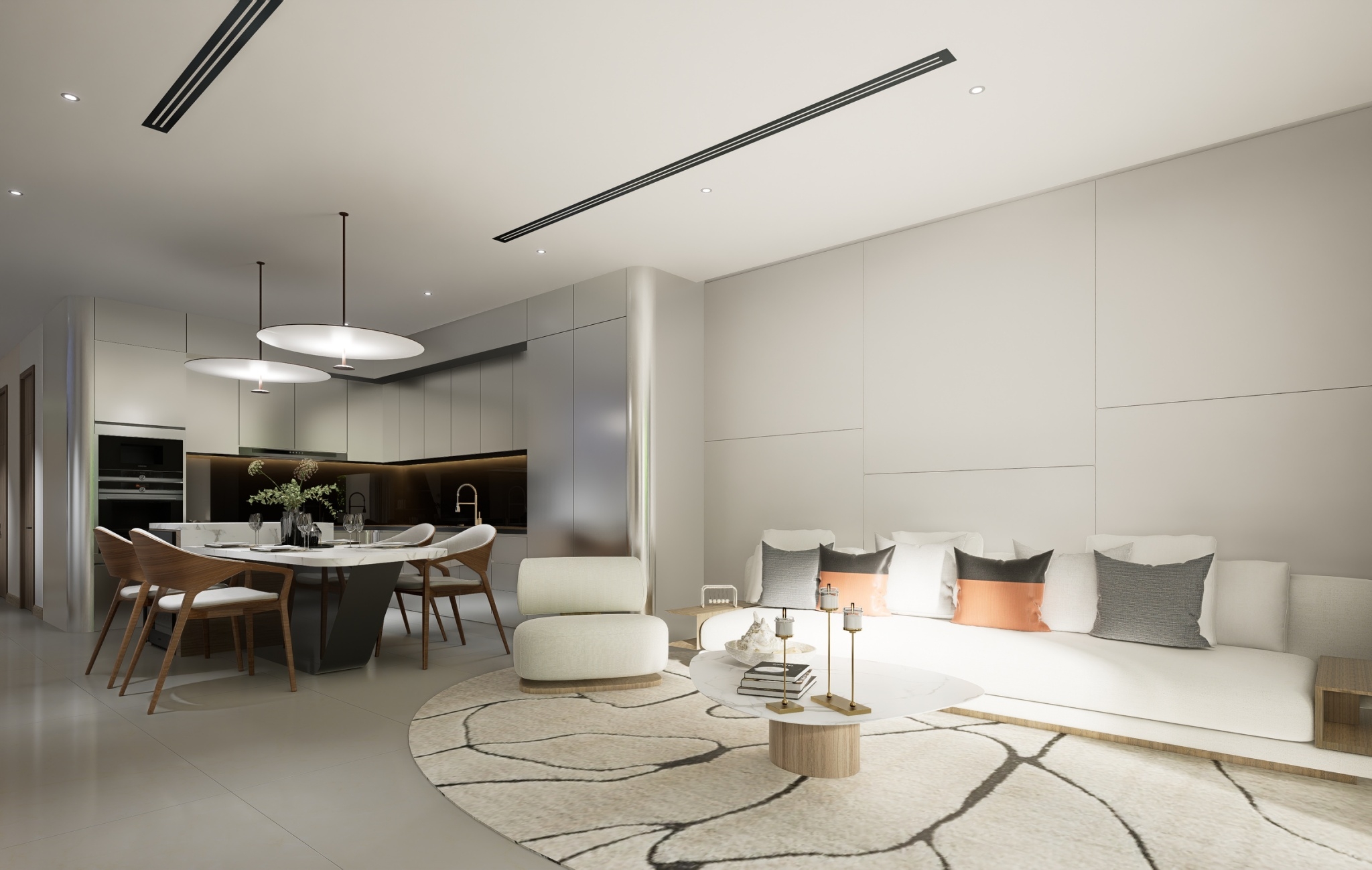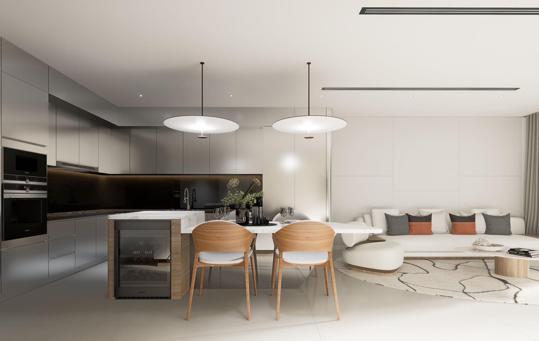 The living area is both elegant and functional, designed to accommodate intimate gatherings or quiet nights in. The thoughtfully designed modern kitchen features high-end appliances, sleek cabinetry, and ample counter space, making it perfect for preparing gourmet meals or casual dining.