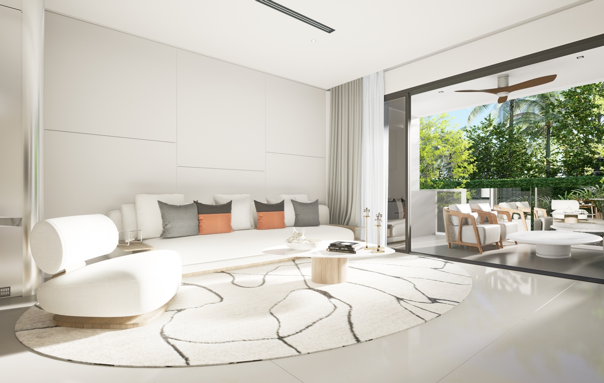 The open-plan layout creates a seamless flow between spaces, amplifying the sense of freedom and relaxation. High ceilings and floor-to-ceiling glass windows invite abundant natural light, enhancing the airy and sophisticated ambiance.
