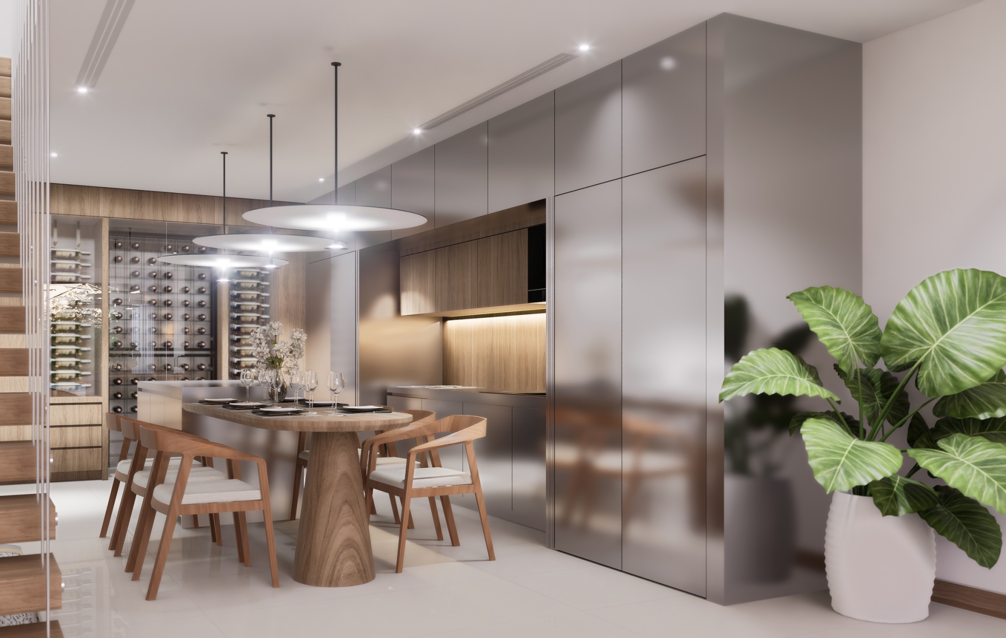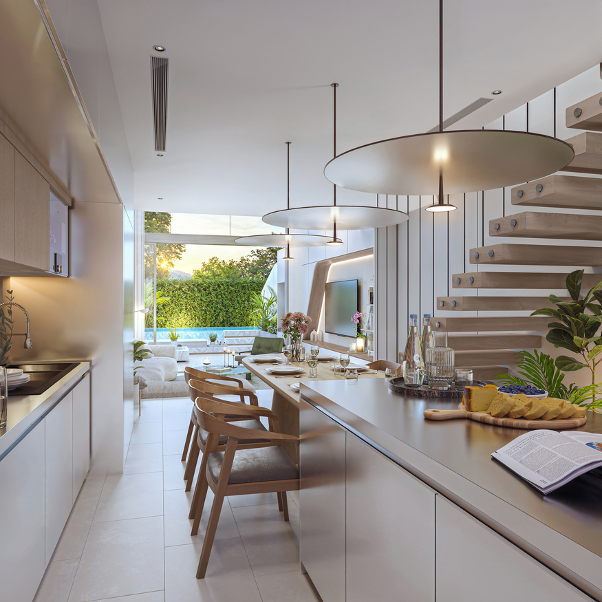 On the first level, residents are welcomed into a bright, open-plan living and dining area, perfect for entertaining or relaxing. The floor-to-ceiling glass windows flood the space with natural light and provide seamless access to a private outdoor terrace, creating a harmonious indoor-outdoor living experience.
