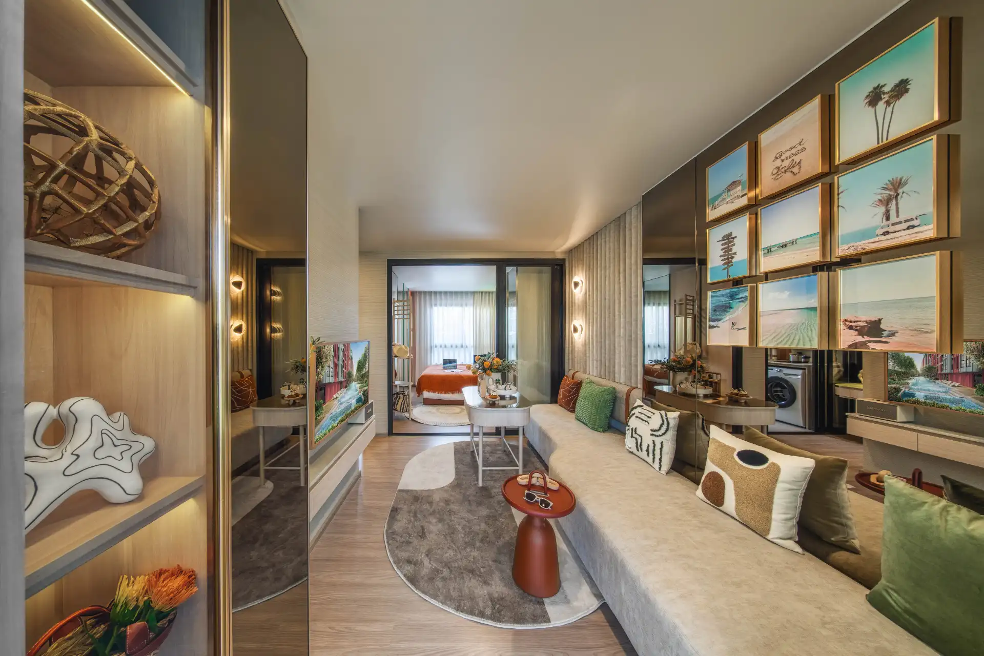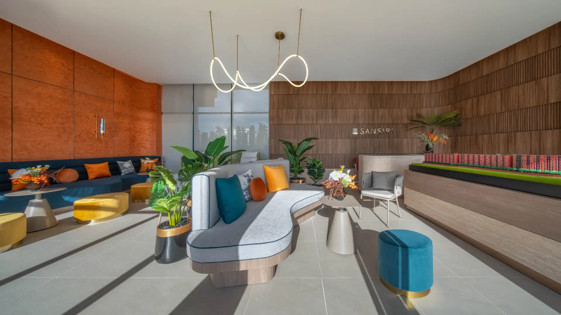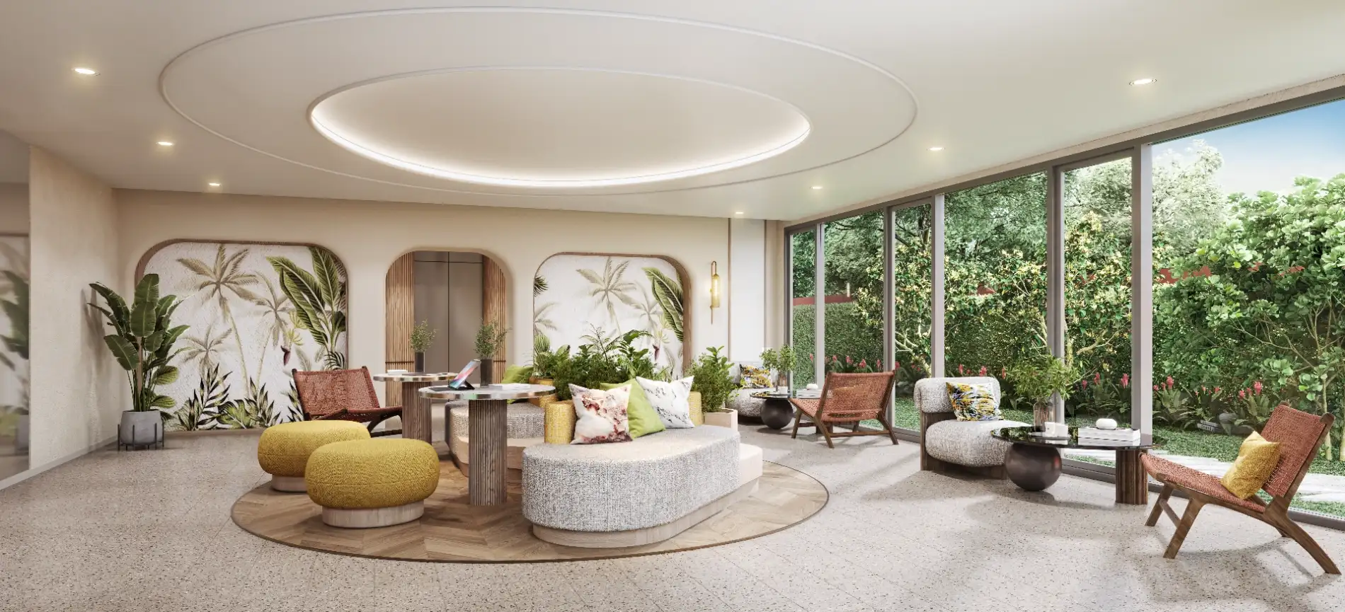 The beautifully designed lobby creates a warm first impression with soothing beach-inspired tones, high ceilings, and abundant natural light. It serves as a welcoming communal space for residents and visitors.