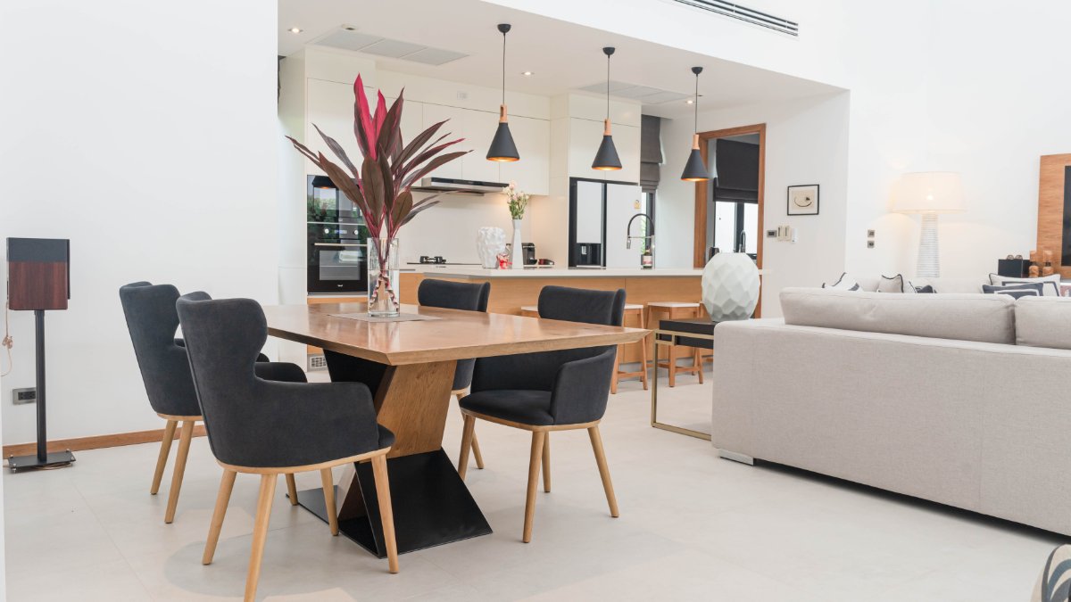 Spacious open-plan living and dining area with vaulted ceilings and limed teak accents