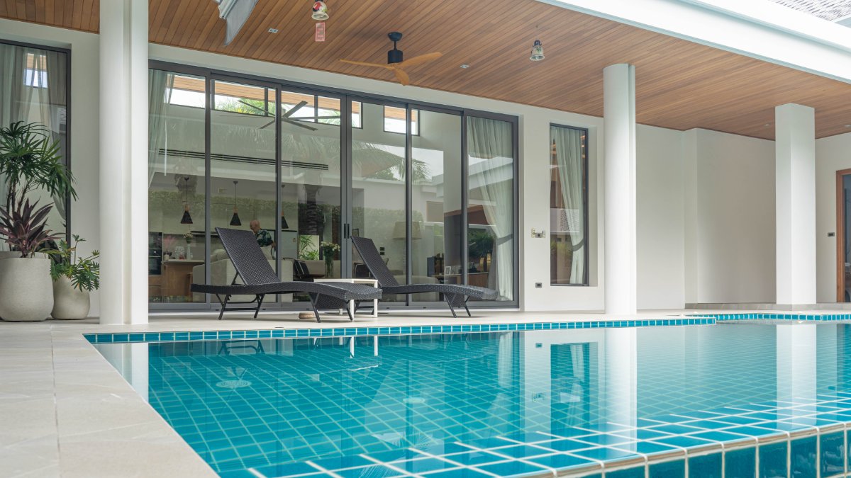 Floor-to-ceiling sliding doors opening to the pool terrace for seamless indoor-outdoor living