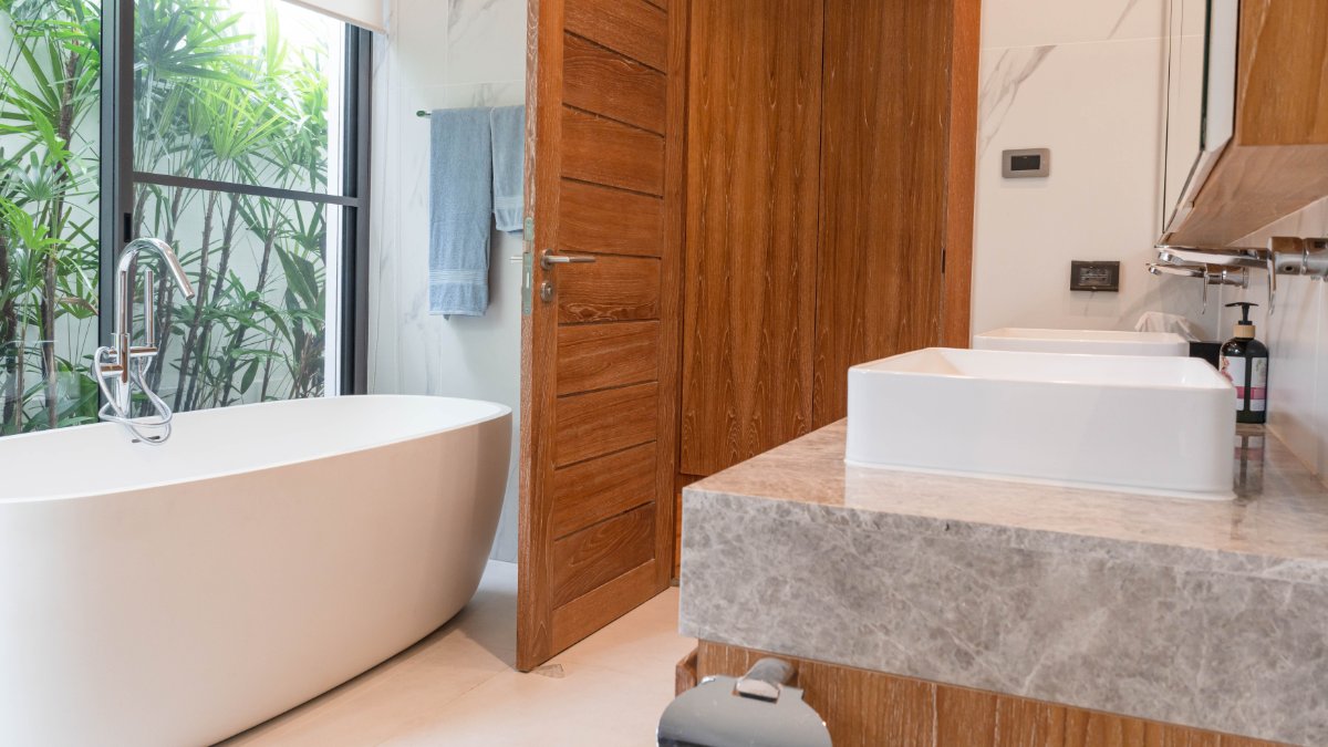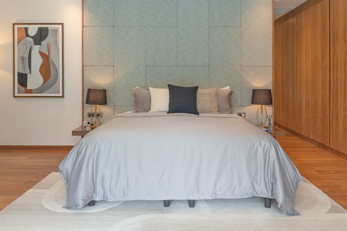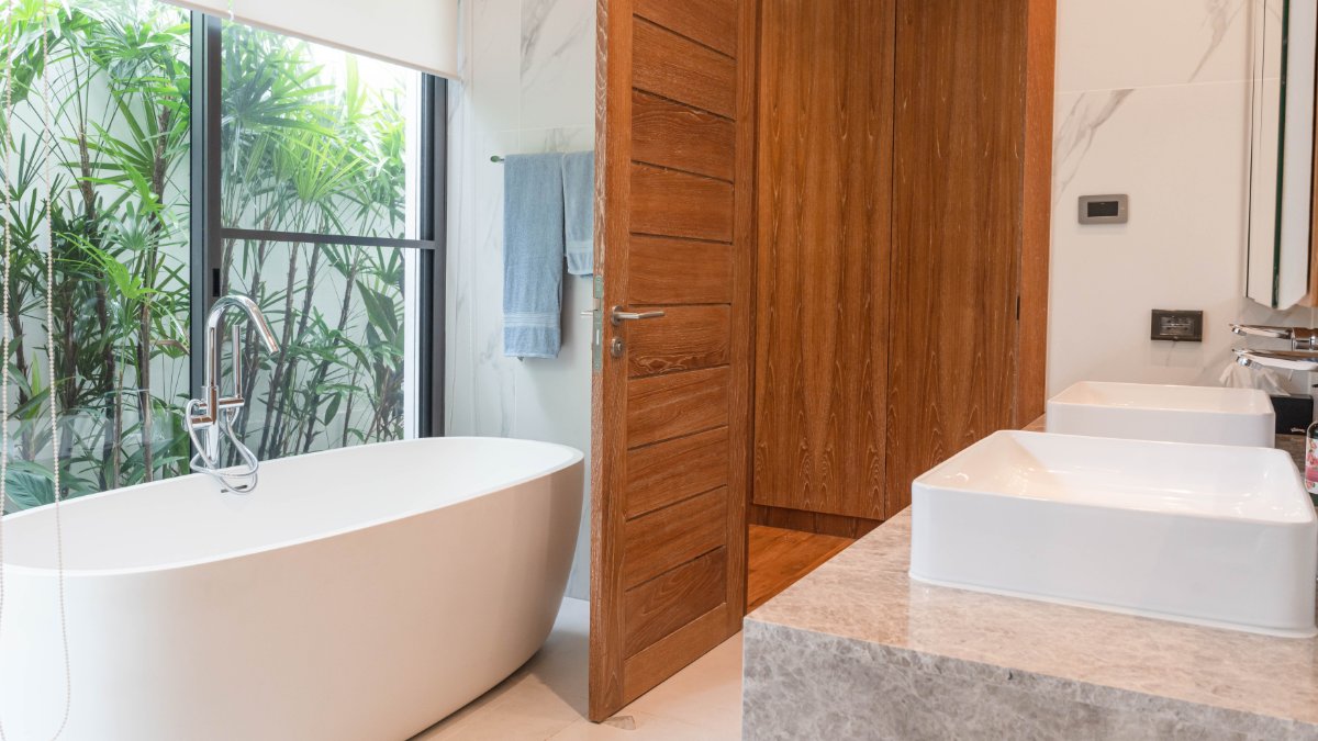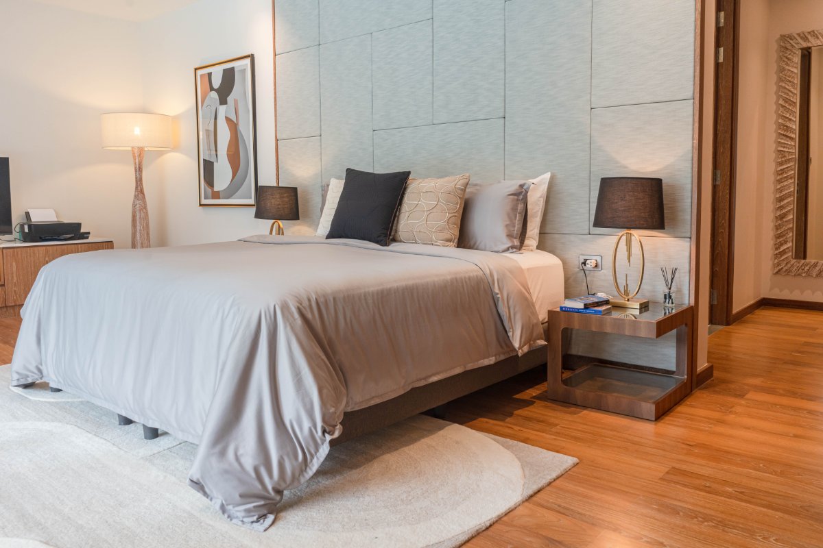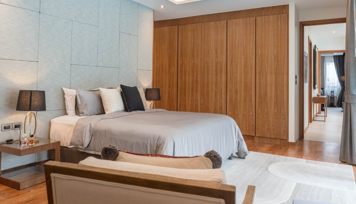 Master suite with solid teak flooring, walk-in wardrobe, and luxurious ensuite