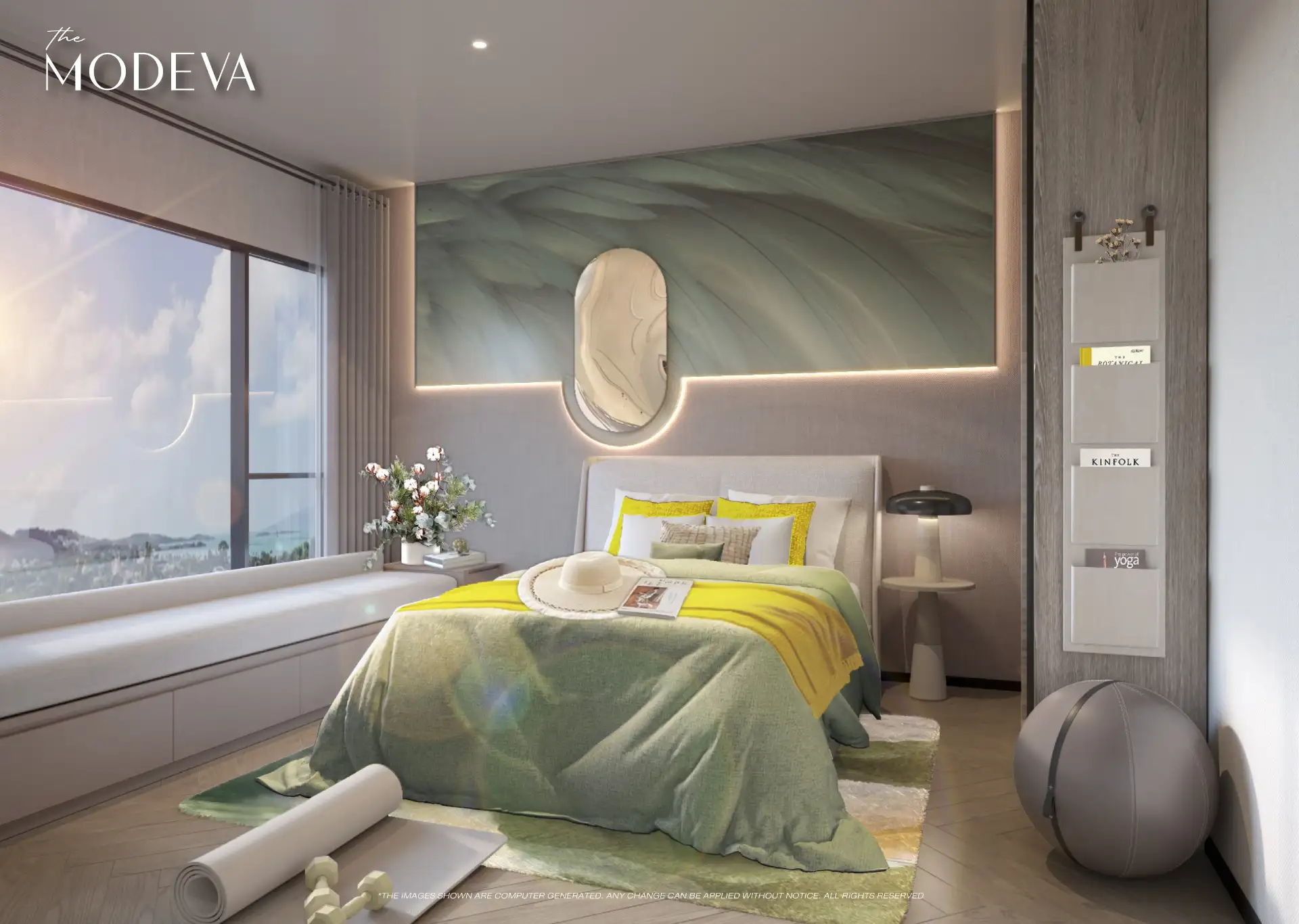 Drawing inspiration from the gentle rhythm of ocean waves, the design of The Modeva evokes a feeling of movement, calmness, and freedom. Curved lines, natural textures, and organic materials dominate the interior and exterior, making each space feel warm and welcoming. The 1-bedroom units are no exception—they reflect the larger project’s concept of “the vibes of pleasure,” where everyday living becomes a sensory experience.