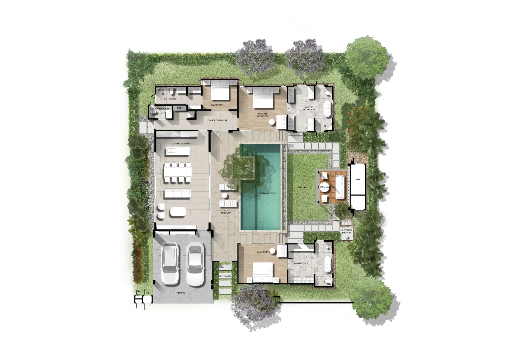 One of the highlights of the design is the double master bedroom concept, where both master bedrooms offer direct access to the swimming pool. These bedrooms include spacious ensuite bathrooms and provide relaxing views of the outdoor terrace and pool area.