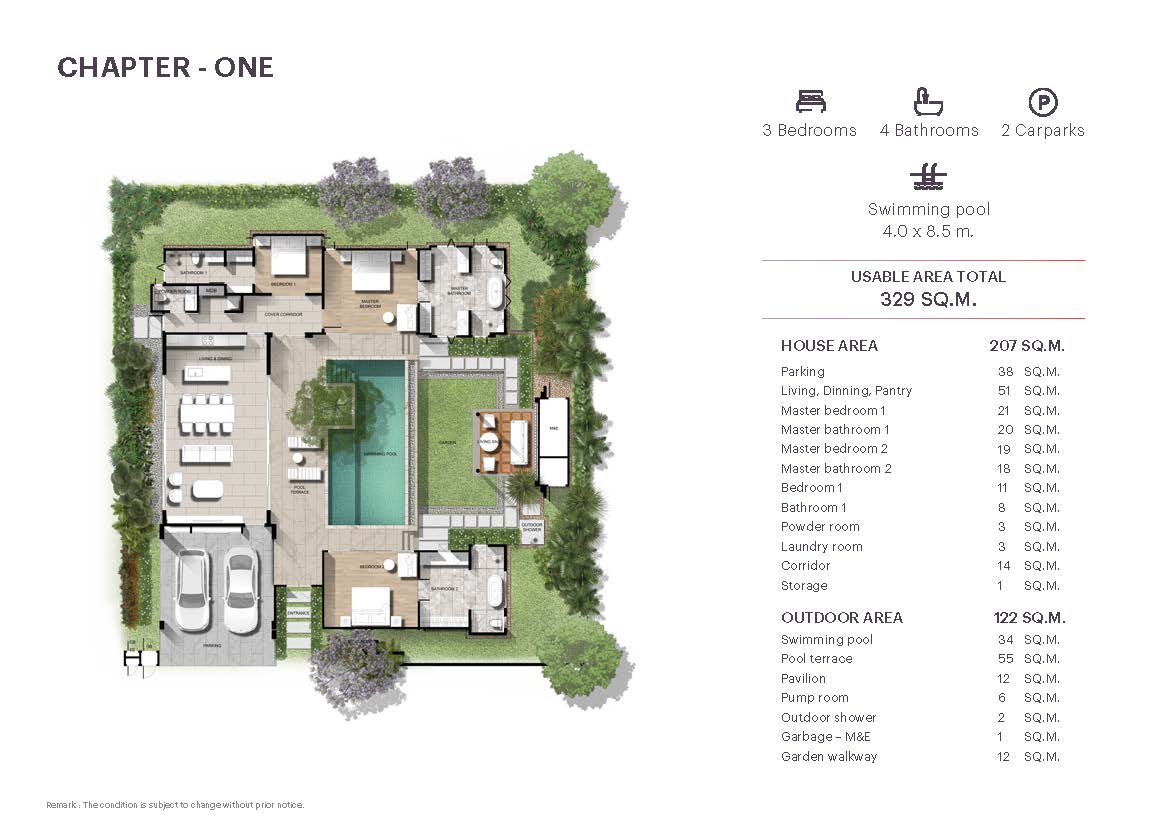 The Tales Story One – Chapter One offers a thoughtfully designed 3-bedroom layout, including a double master suite with direct access to the pool and an expansive ensuite bathroom. Each bedroom is spacious, private, and carefully positioned for natural light and garden views.