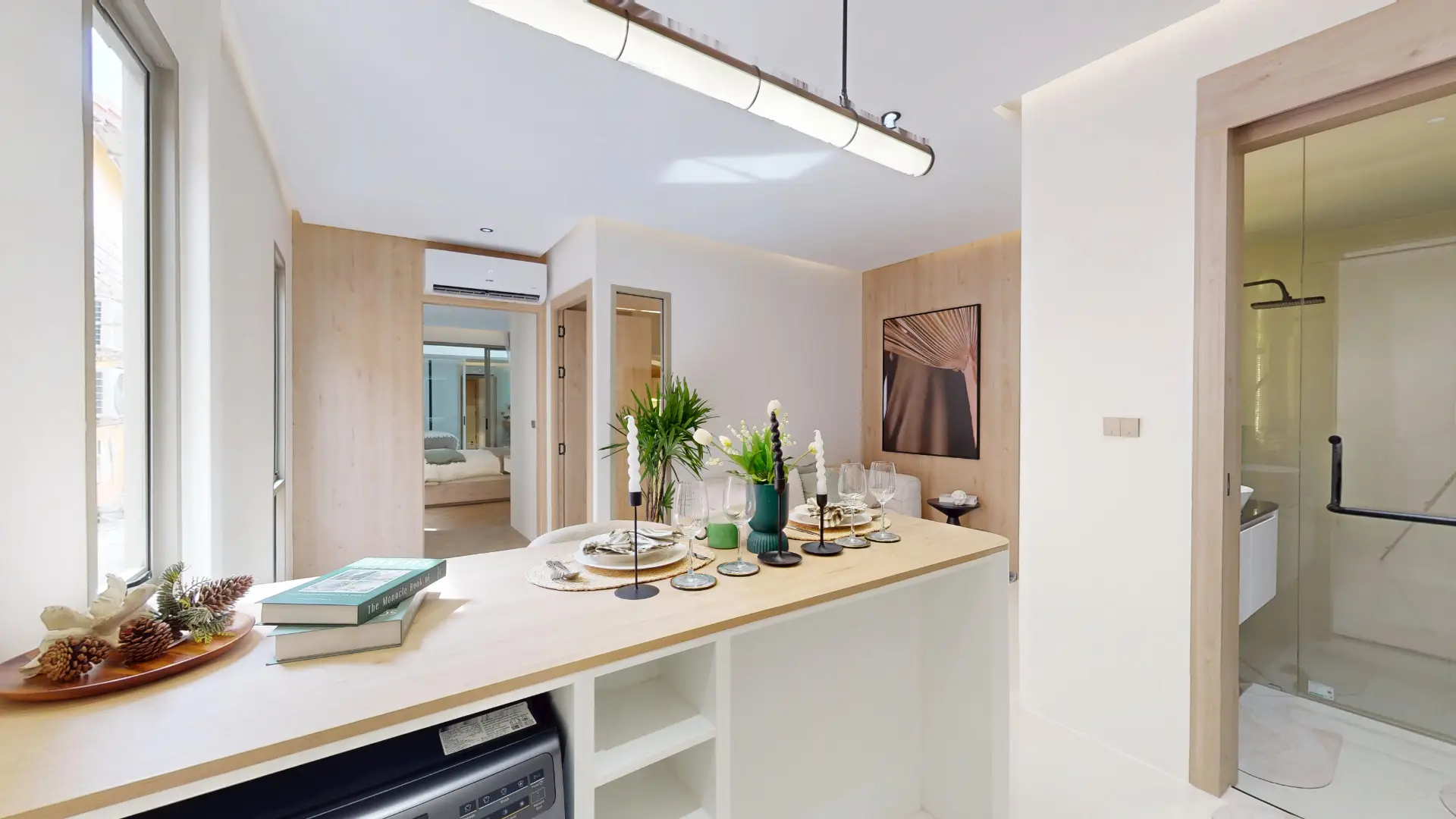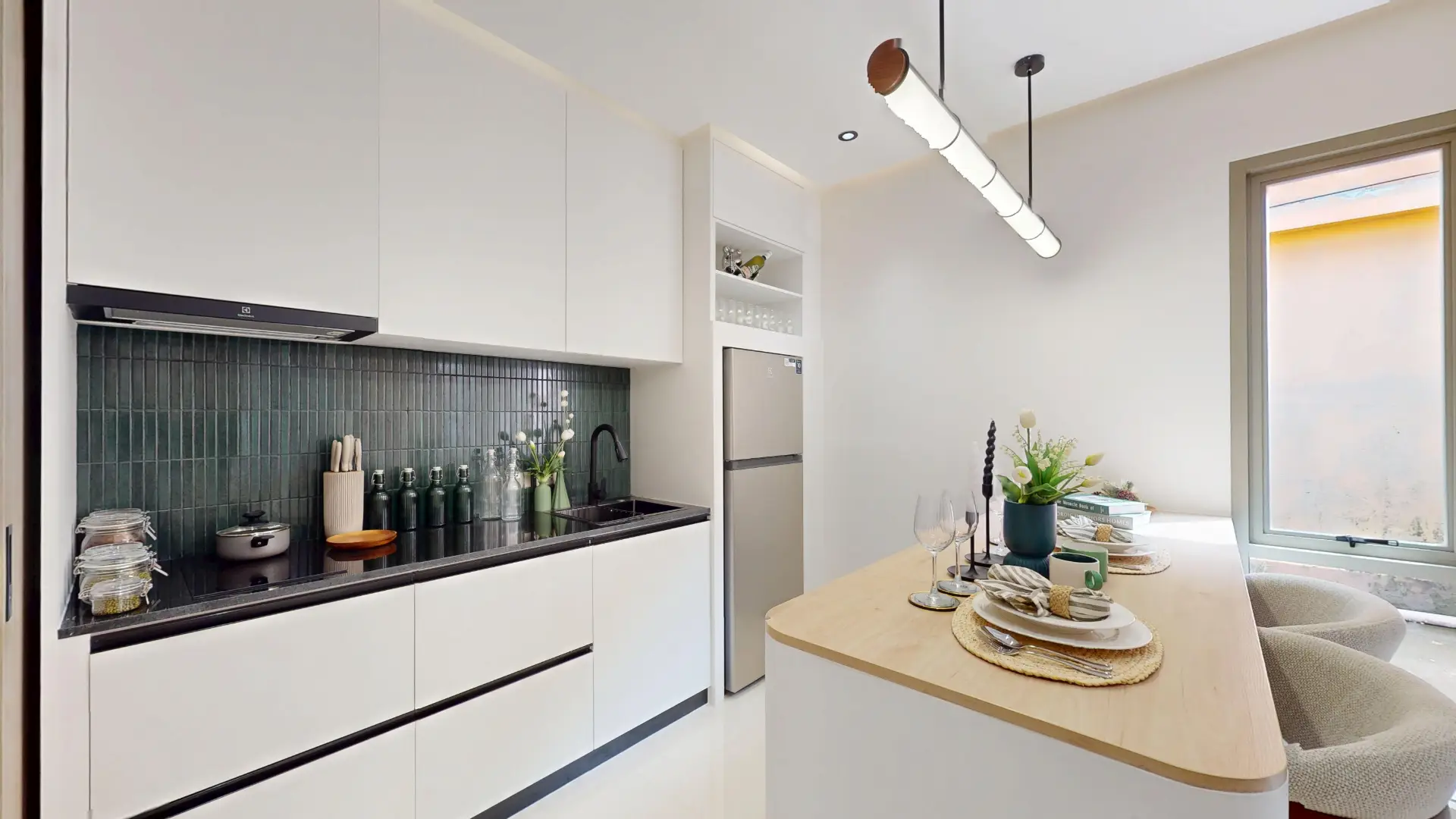 The 2BR unit includes a fully equipped modern kitchen with stylish cabinetry, durable countertops, and essential appliances, making it perfect for everyday cooking as well as entertaining. Its practical layout ensures plenty of storage while maintaining a clean, sleek aesthetic.