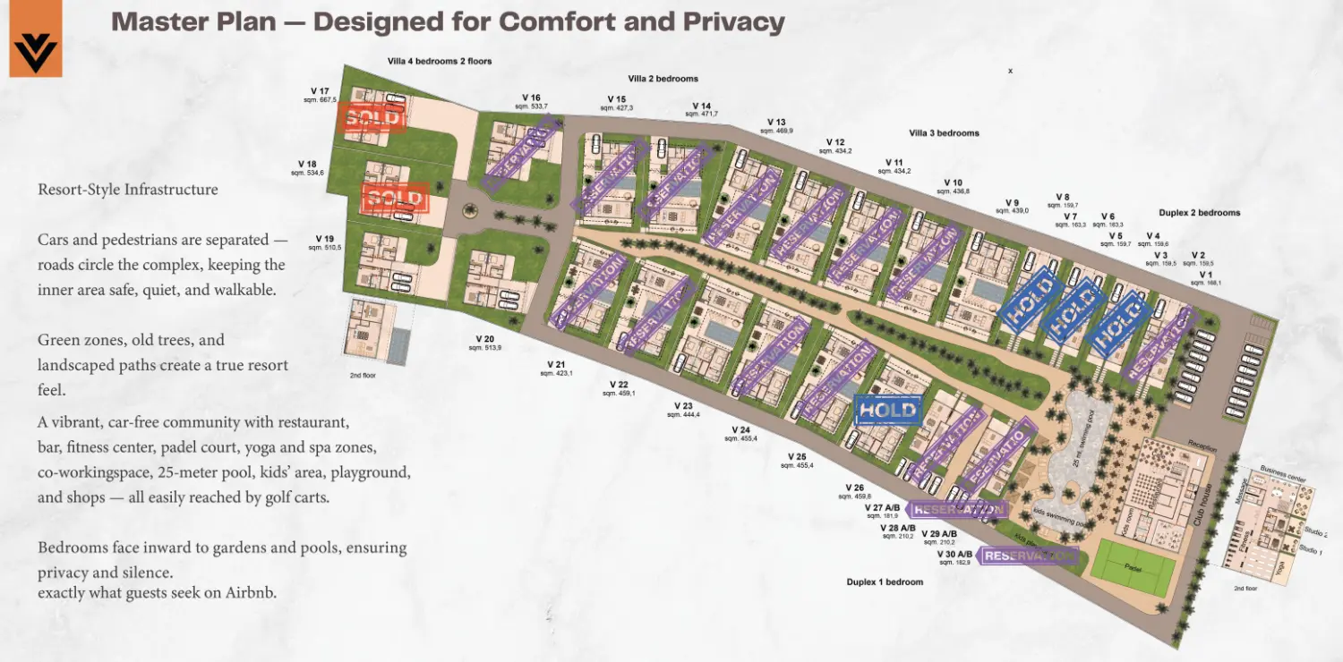 Vehicles stay on the perimeter roads, ensuring the inner zones remain quiet, clean, and safe—something guests highly appreciate during holiday stays.