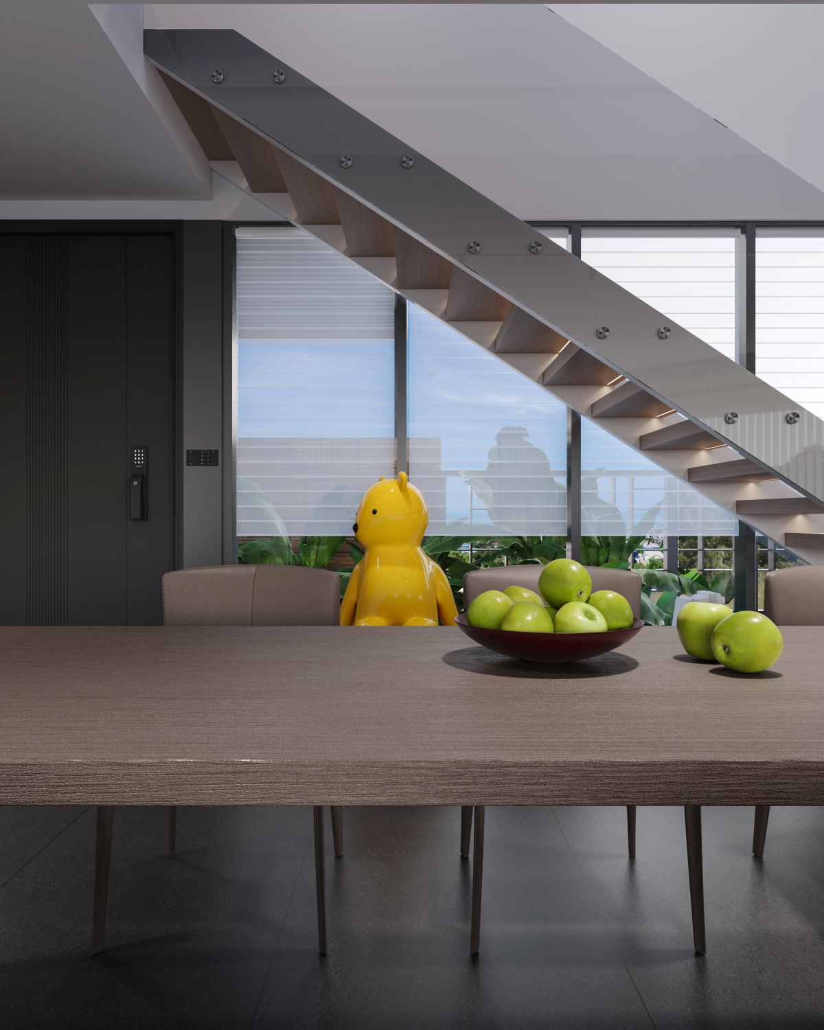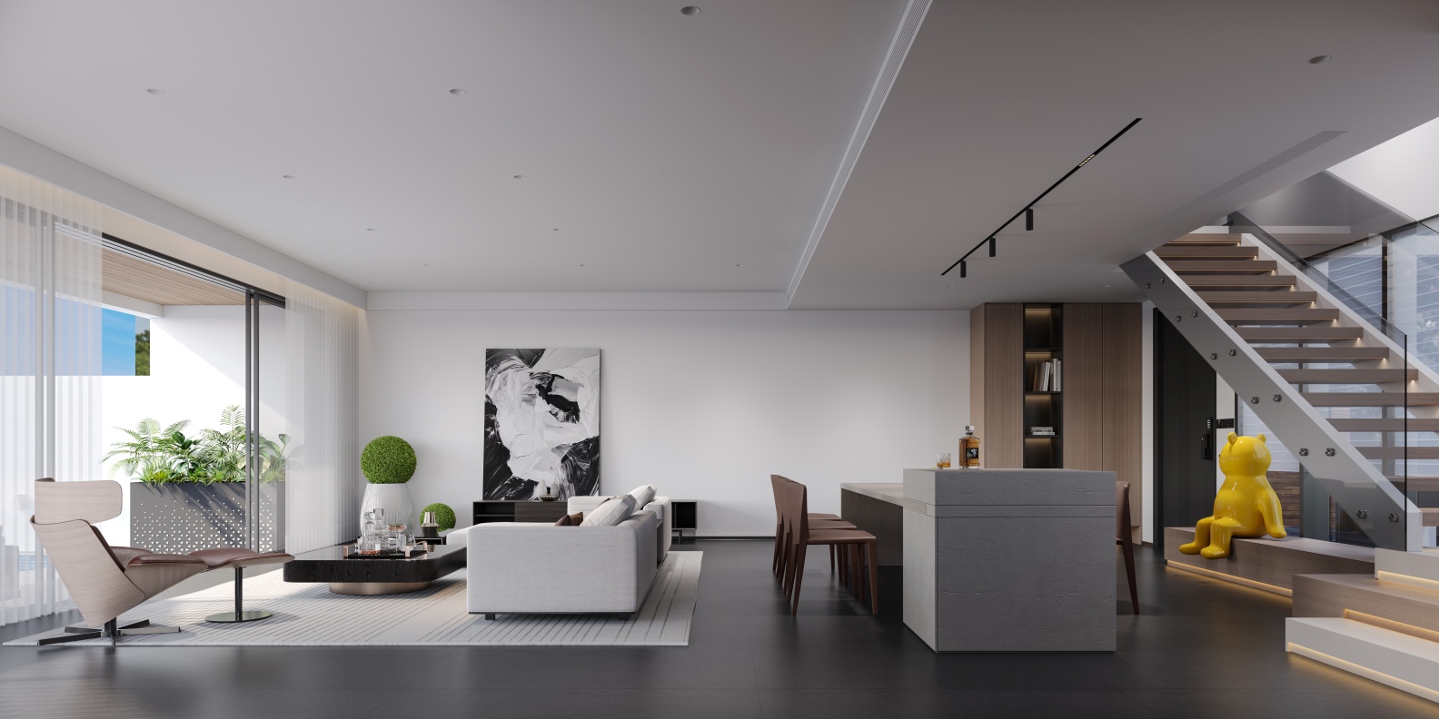A stylish open-plan living and dining area that seamlessly connects to the outdoor terrace