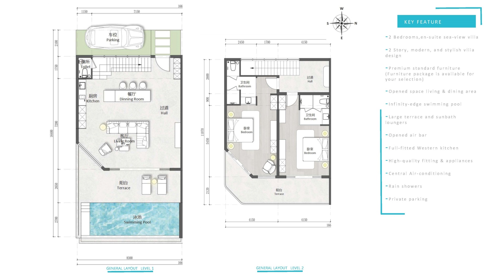 Two-storey villa with 2 bedrooms, 2 ensuite bathrooms, and 1 guest toilet