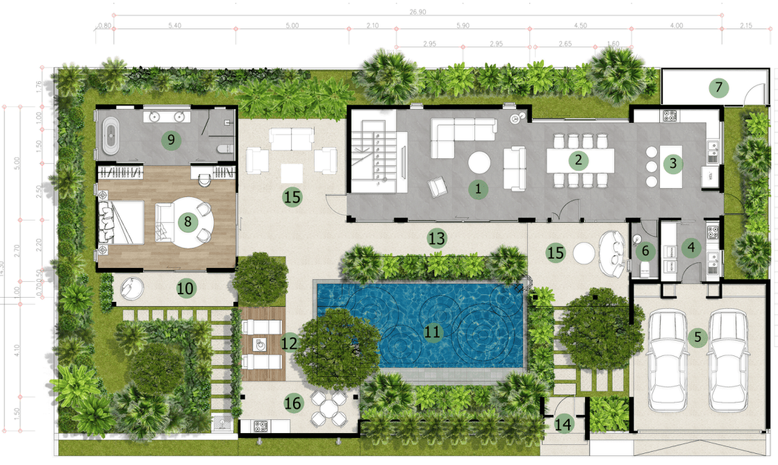 Each villa in the community enjoys private, tropical landscaping, including the signature 6-meter-tall Poonthap tree, offering shade, character, and charm.