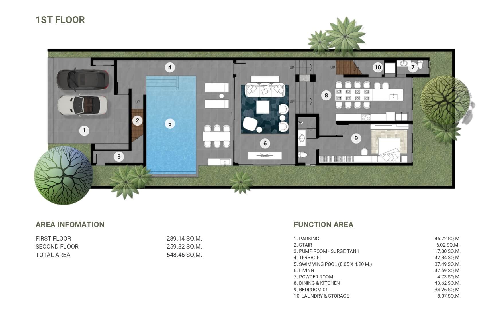 Each villa at Wallaya Hill offers approximately 457 sq.m. of luxurious living area, thoughtfully spread across two floors. With land plots ranging from 420 to 510 sq.m., these homes provide ample space for families, entertaining guests, or simply indulging in the pleasures of everyday life.